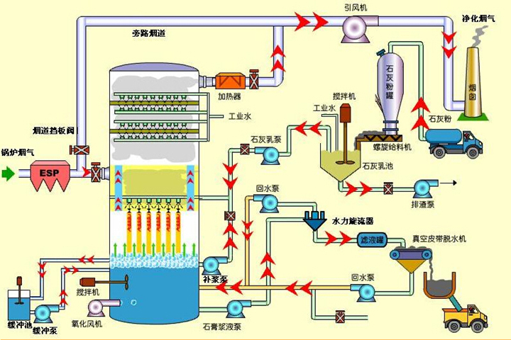 “石灰石-石膏”濕法脫硫工藝鍋爐引風機排出的原煙氣由增壓風機導入脫硫系統,通過GGH(氣體加熱器)進行熱交換后煙氣進入吸收塔。鍋爐引風機排出的原煙氣由增壓風機導入脫硫系統,通過GGH(氣體加熱器)進行熱交換后煙氣進入吸收塔。在吸收塔內,原煙氣自下而上通過塔身,遇噴淋系統噴出的霧狀石灰石漿液逆流混合,脫硫后的凈煙氣經噴淋系統上部的除霧器除去煙氣所攜帶的霧滴后排除吸收塔進入GGH,經過GGH換熱升溫后經煙囪排出。