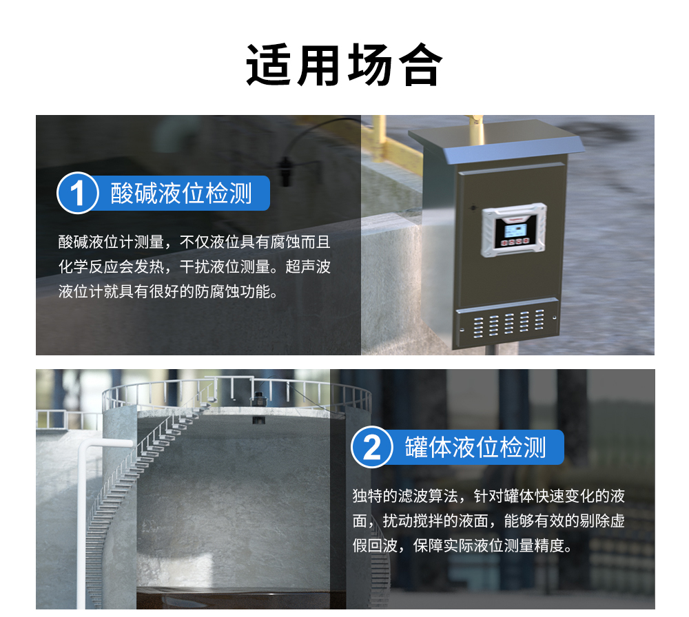 應(yīng)用行業(yè) 利用超聲波在遇到不同密度的液介質(zhì)(固介質(zhì))分界面時發(fā)生反射,通過測定傳輸時間來測量液位/距離。